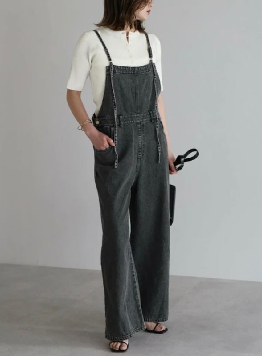 ネックラインのボタンがアクセントになり、程よい抜け感を演出します。