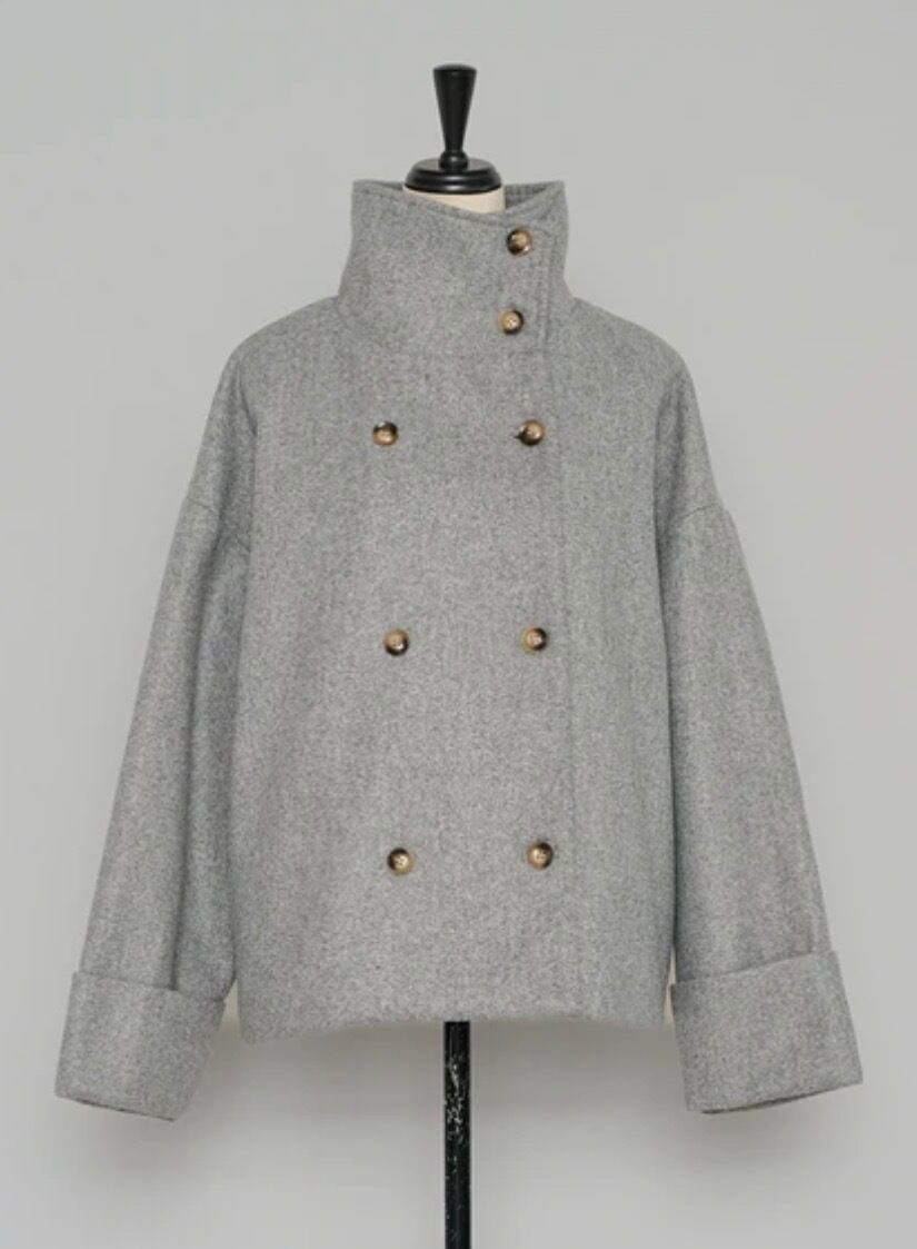 ダブルボタンと広めの衿がアクセントになり、コンパクトながら存在感のある仕上がり。