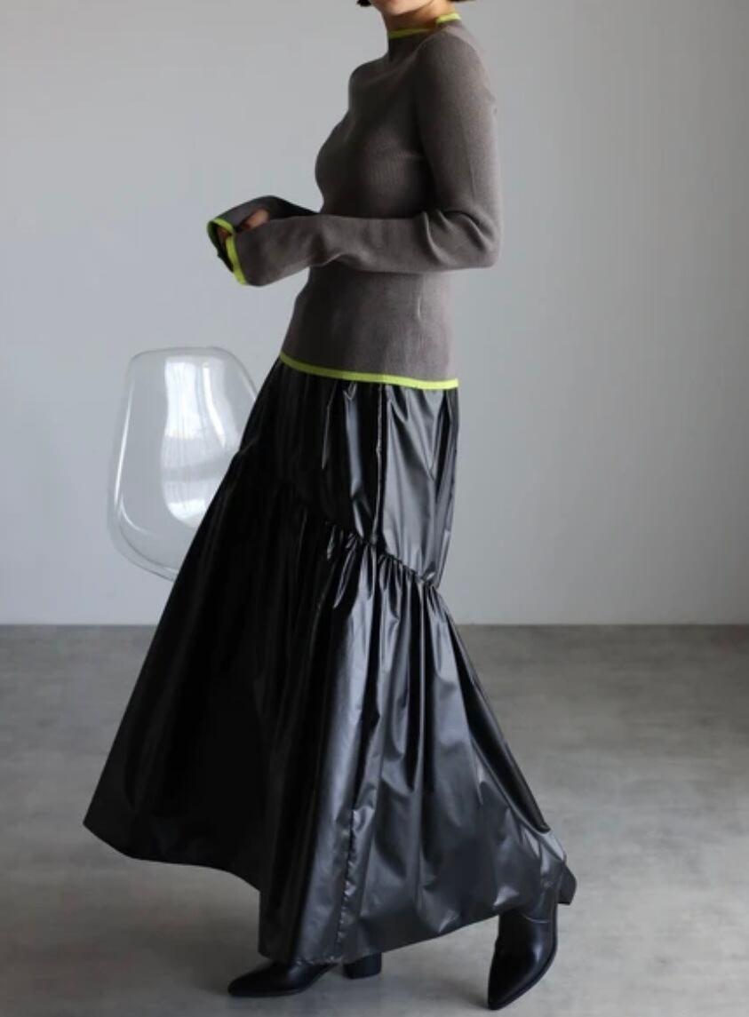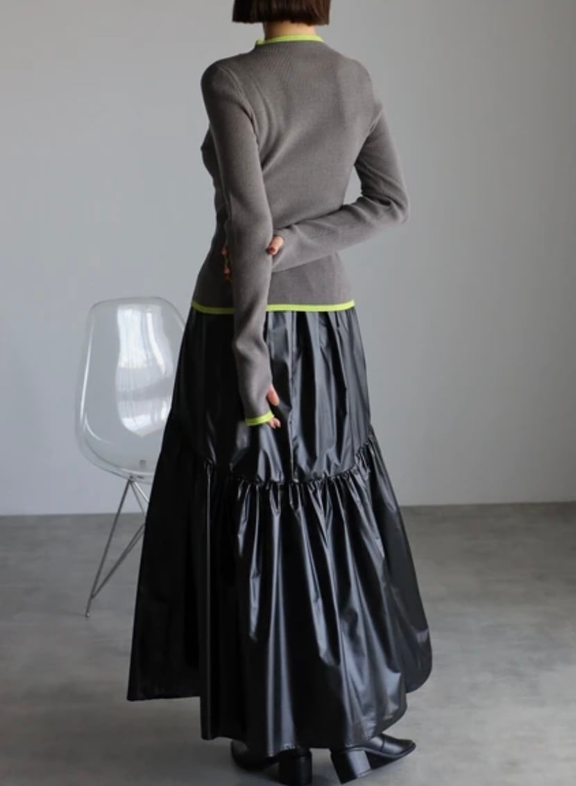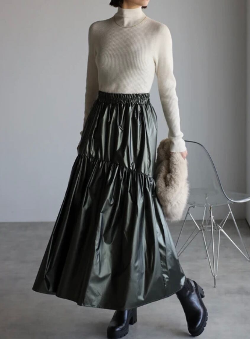 シーズンムードを高めるレザー調の光沢感に、ふわっと広がるギャザーが魅力のスカート。