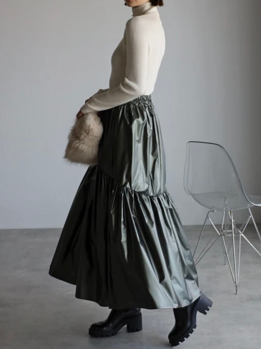 軽くて柔らかい生地感のマットメタリックが魅力!切替ギャザーのフレアスカート